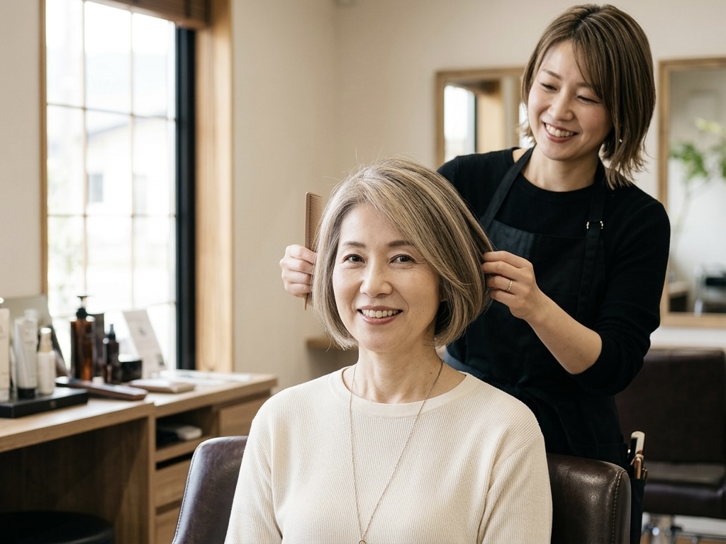 最近では、白髪を活かし、明るく自然な色に仕上げる方法が人気です。例えば、白髪をぼかすように細かいハイライトを入れたり、明るいトーンのヘアカラーを重ねたりすることで、伸びてきても境目が目立ちにくく、長持ちするスタイルが叶います。さらに、肌の色を明るく見せる効果も期待できるため、若々しい印象を与えます。